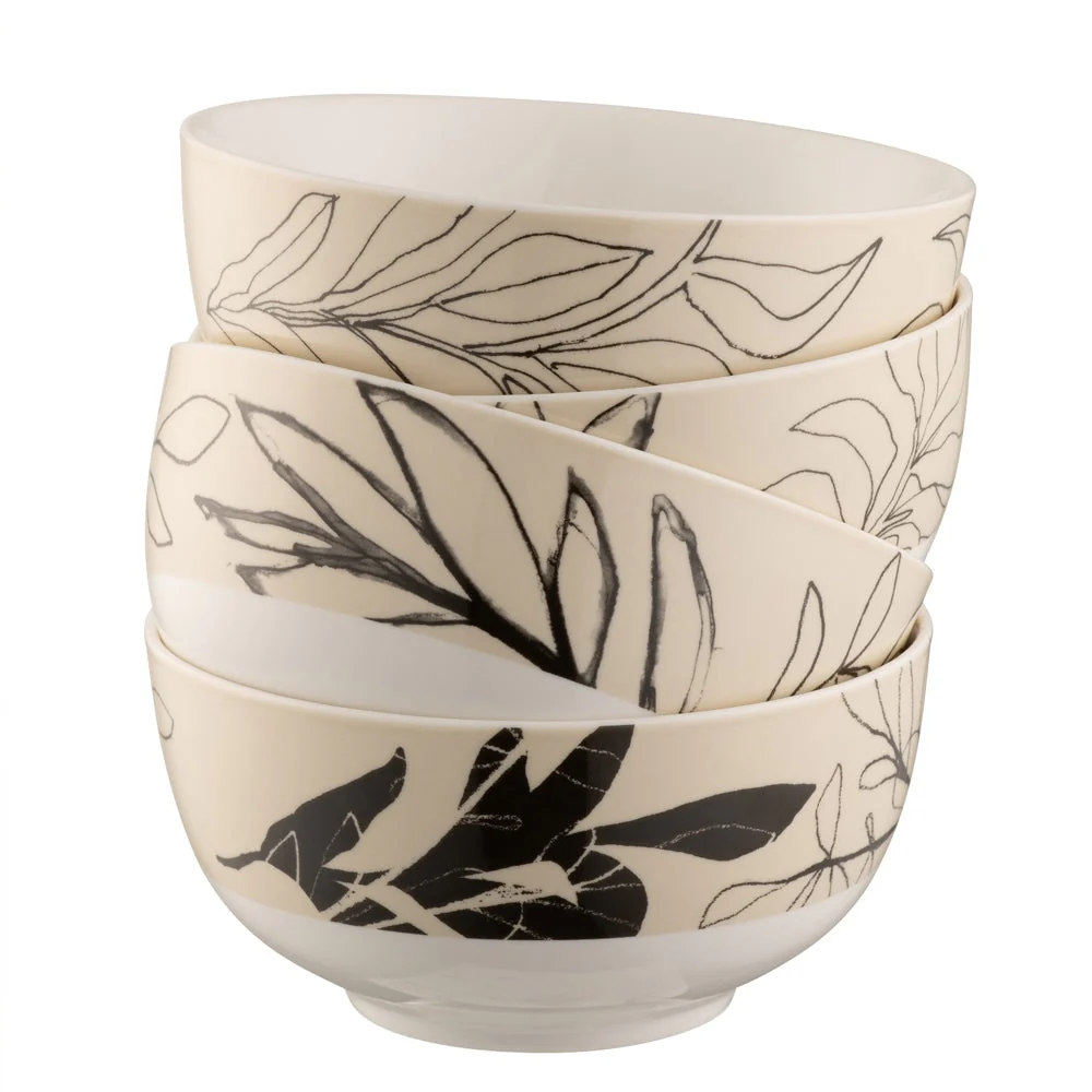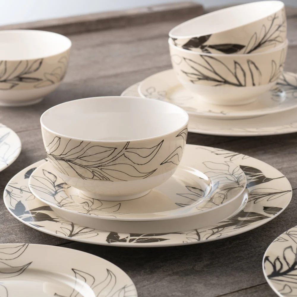 - Taking inspiration from the natural environment, simple abstract motifs, sketches and drawings of flora are rendered in timeless black and warm off white tones on contemporary Fine China tableware.