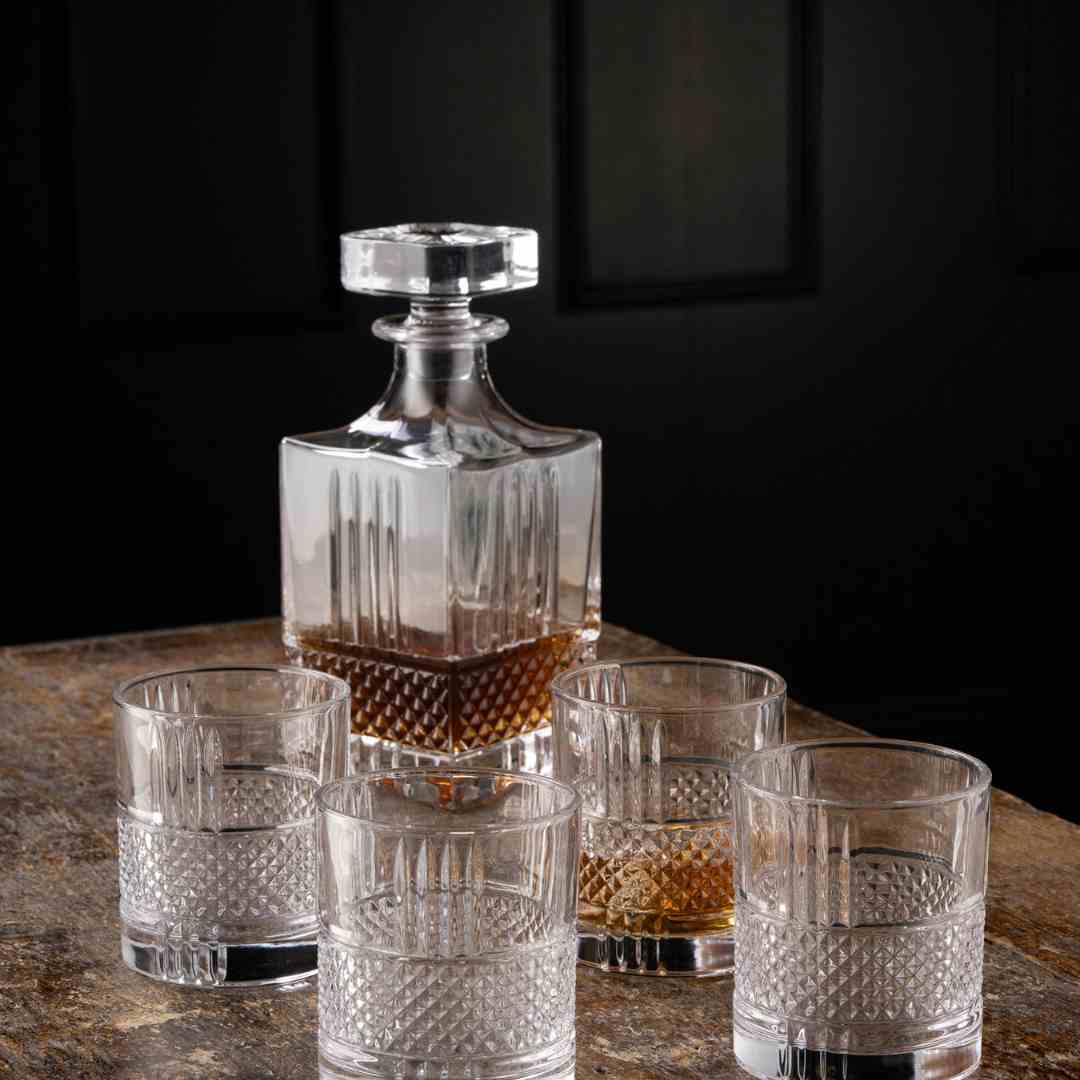 - The Eyre Decanter Set has a beautifully cut square decanter with 4 whiskey glasses.