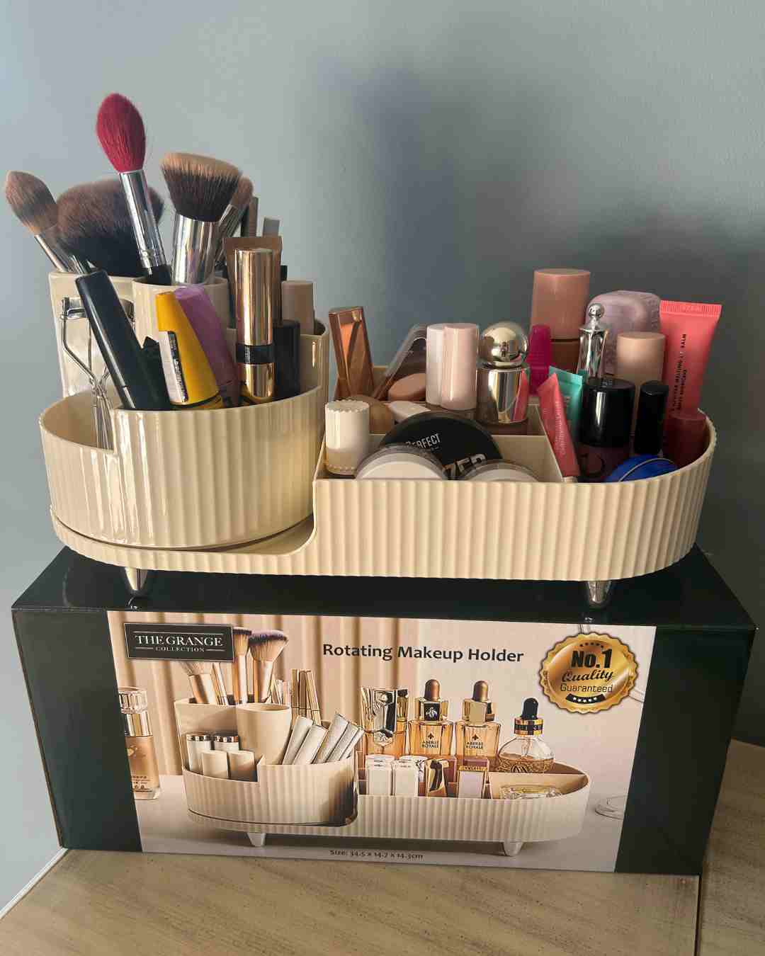 - Designed with multiple compartments and a rotating base, this chic organiser makes it easy to access your makeup, skincare, and beauty tools.