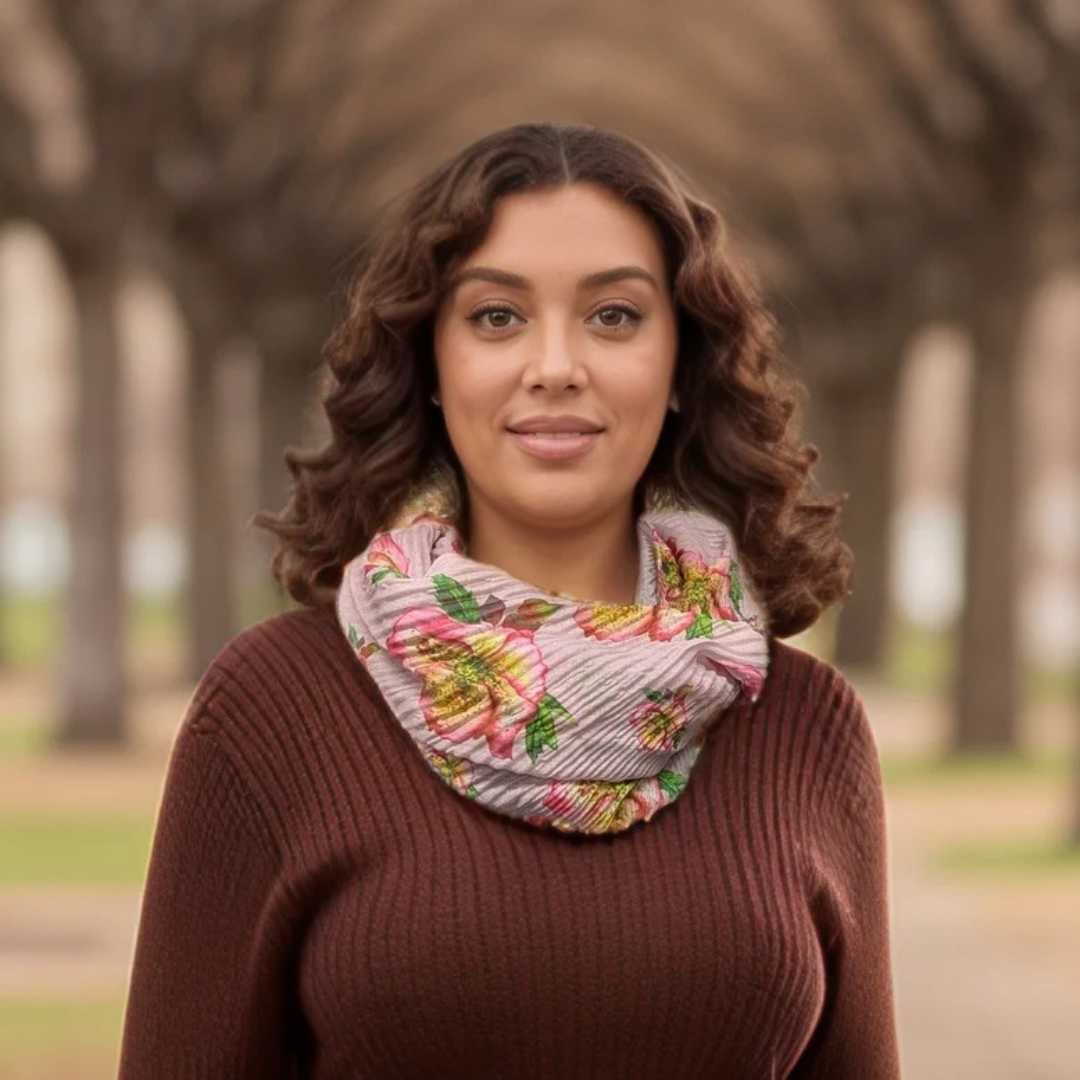 - Crafted with a romantic floral print and gentle pleated texture, this snood fastens with a magnetic clasp for quick, effortless wear.