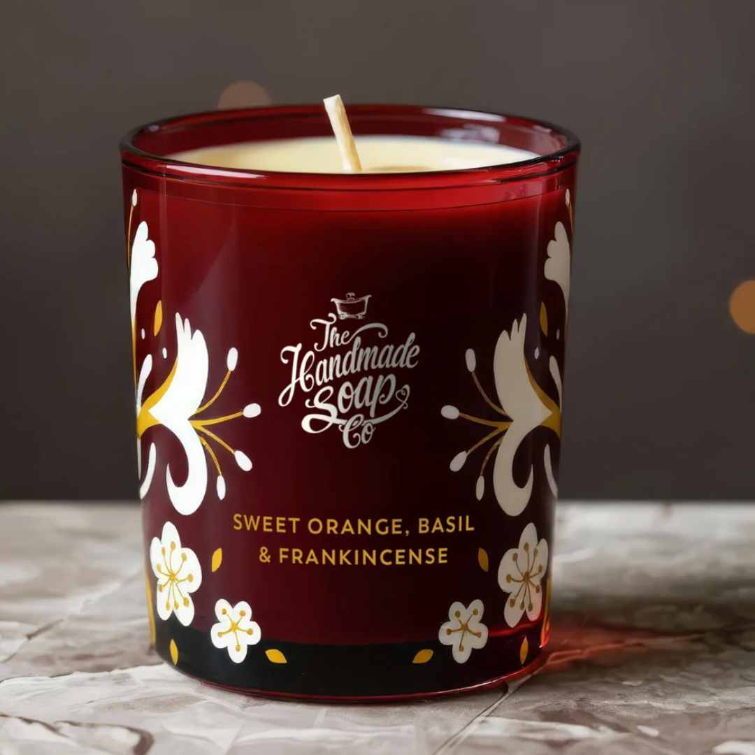 - This elegant set includes a hand lotion, hand wash, a soap bar, and a small candle, all featuring the comforting and serene fragrance of sweet orange, frankincense, and basil.